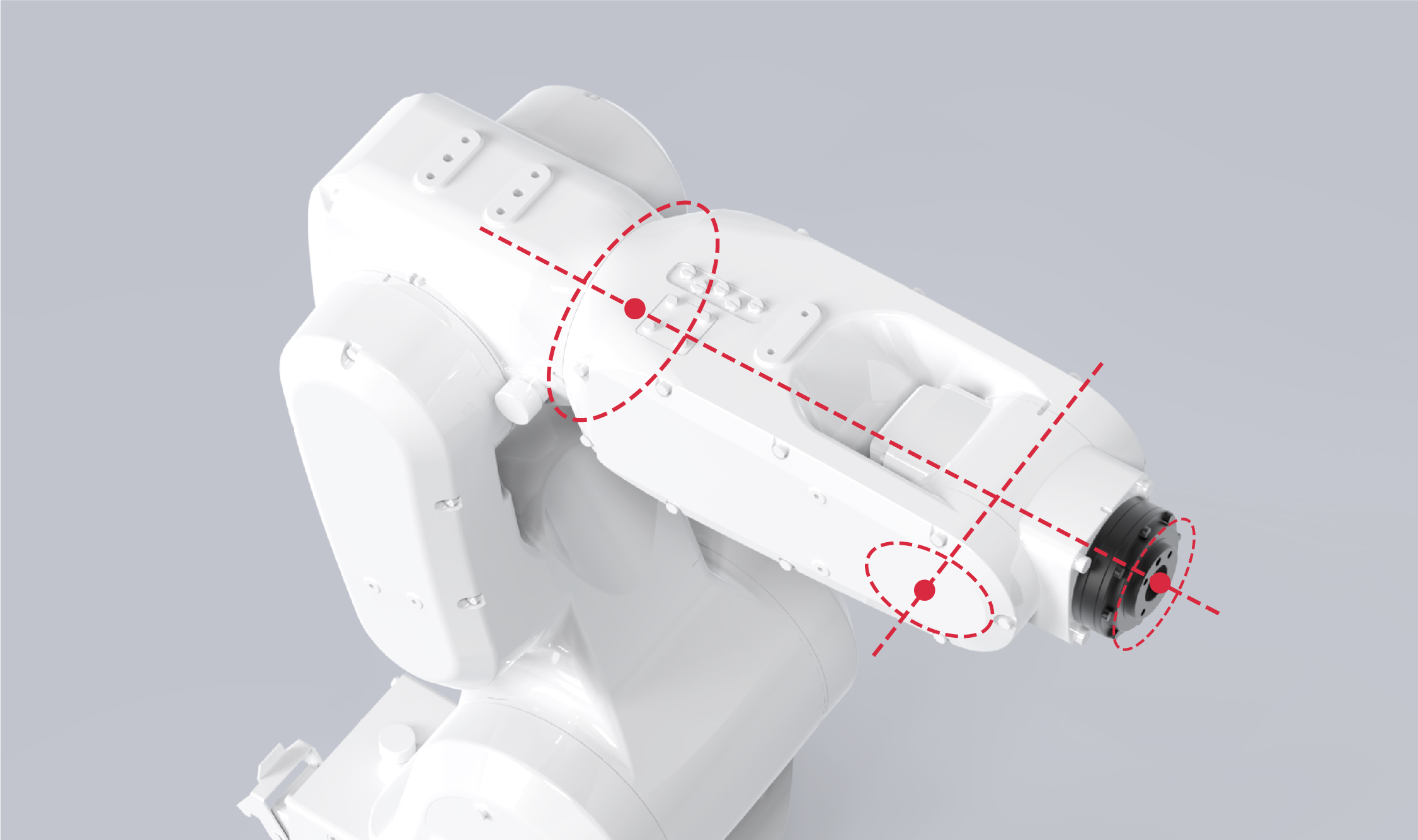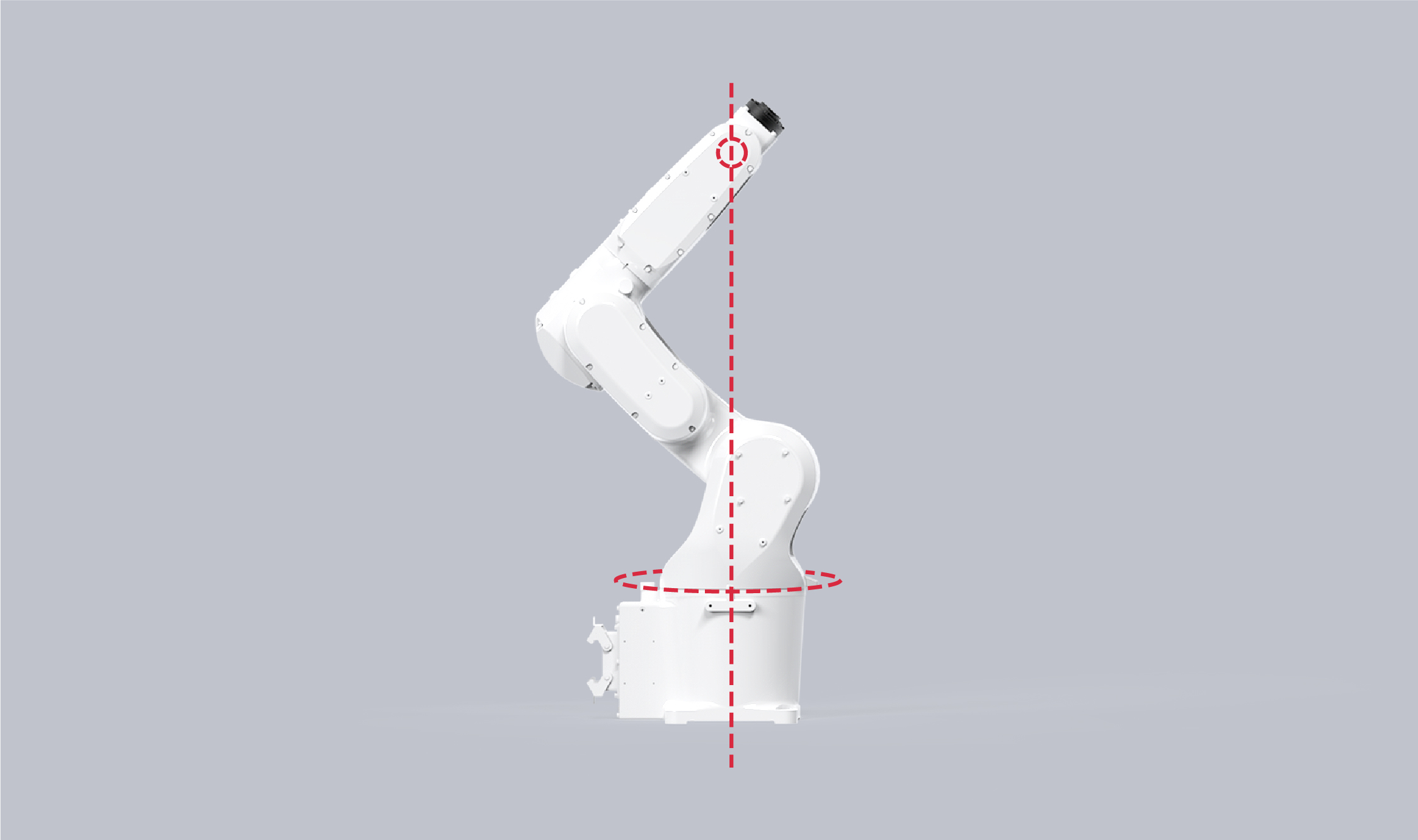 腕關節奇異點是指在機器人運動空間內,關節4和關節6的軸線與關節5的軸線在同一平面內。如下圖所示。