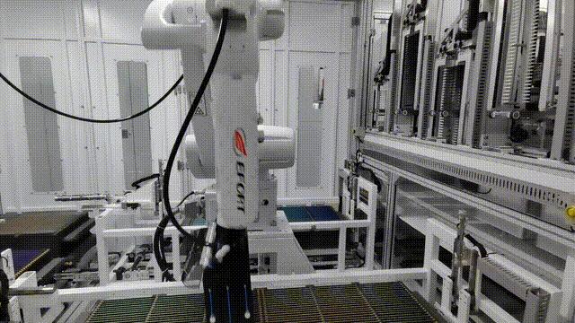 “插片”是電池片生產中技術門檻較高的環節之一,由于電池片易碎、易被污染等特性,對機器人的精度、速度與可靠性都有著極高的要求。電池片與定位卡槽之間間隙是0.2mm,考慮到夾具工裝誤差,需要機器人保證不超過0.15mm的軌跡重復性誤差。埃夫特基于自主化驅控平臺,開發了TMove、振動抑制、速度前瞻運控、動力學前饋等一系列共性核心算法,有效地提升了機器人運動節拍和穩定性,讓機器人在插片應用中滿足8200pcs/小時的目標產能節拍。而高潔凈、高良品率的電池片生產要求,又要求機器人需要高防護等級,埃夫特通過本體關節獨有的雙密封技術,手腕部分防護等級為IP67,既能有效避免內部潤滑劑的泄漏造成損失,又能保證機器人使用壽命不受機臺運行過程中酸化液影響。